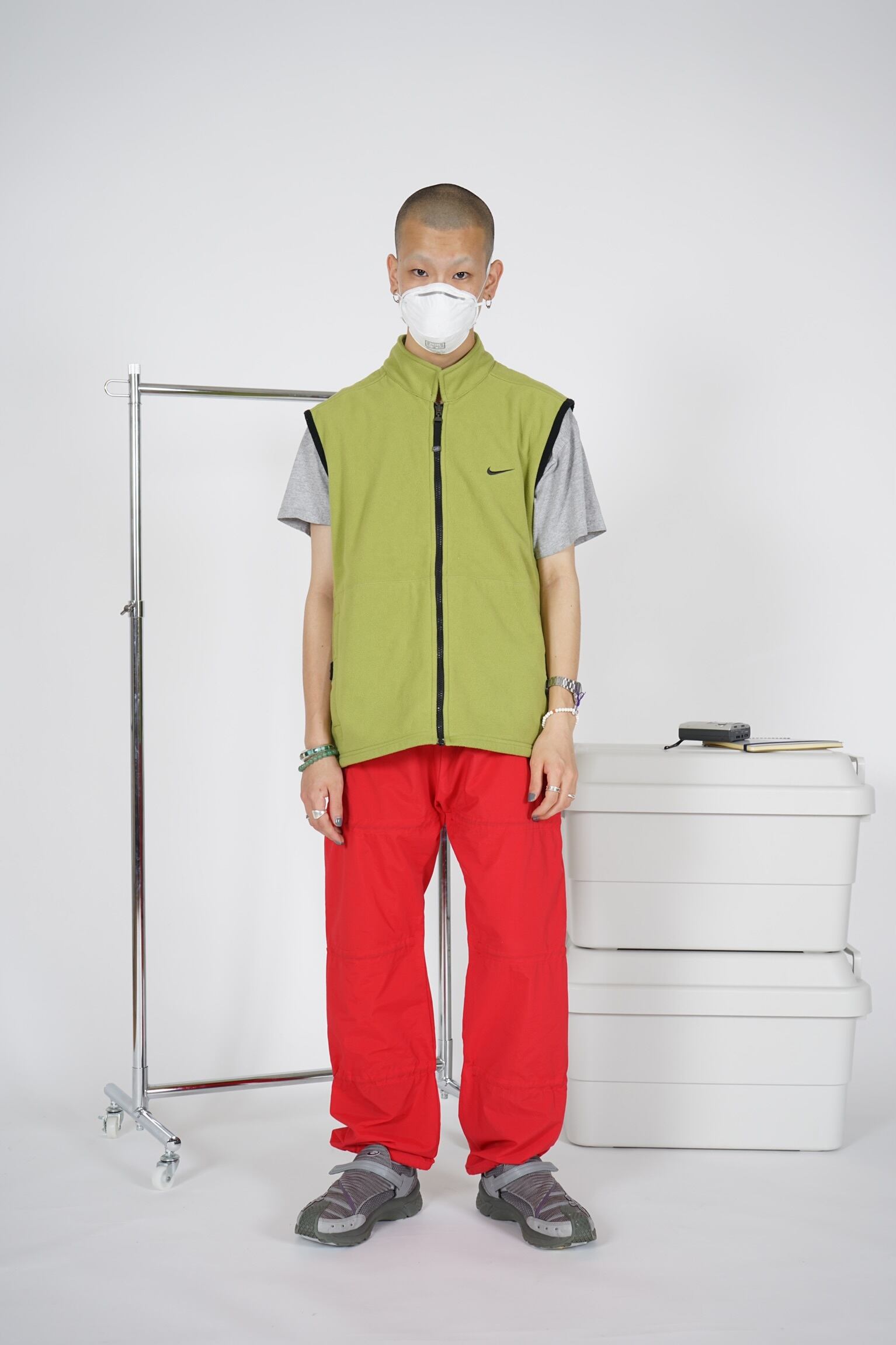 ピスタチオグリーンのボディにが目を引くフリースベストです。